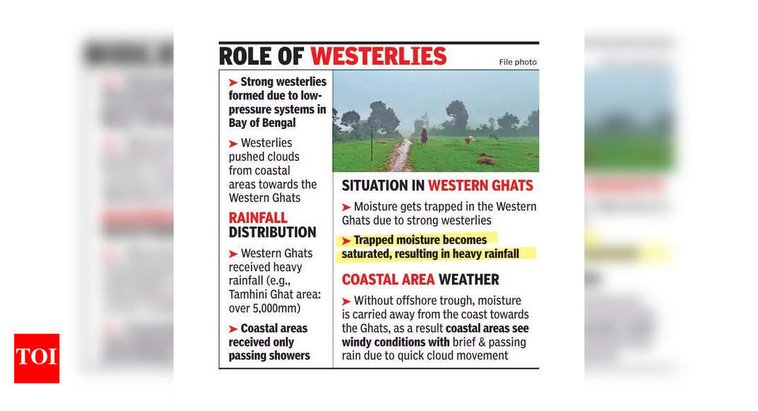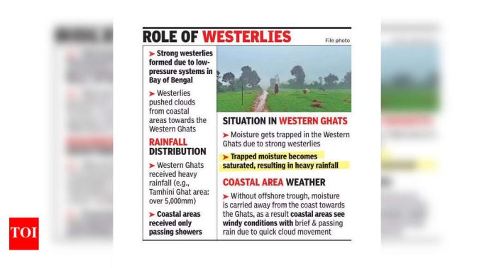 पुणे: महाराष्ट्रातील नुकत्याच झालेल्या पावसाळ्याच्या जादूमुळे मंगळवारपर्यंत पाऊस-कमतरता असलेल्या जिल्ह्यांना 20 वरून केवळ सहा वरून कमी झाले आहे. जवळपास घर, पुणे जिल्ह्यात या हंगामात पावसात 28% अधिशेष दिसून आला आहे.पावसाच्या तुटीला सामोरे जाणारे सहा जिल्ह्यांमध्ये मुंबई शहर (-22%), अहिलियानगर (-27%), बीड (-43%), हिंगोली (-34%), जलना (-27%) आणि लॅटूर (-20%) आहेत, आयएमडी डेटा दर्शविला आहे. यापैकी बहुतेक जिल्हे तीव्र पाणी-तणावग्रस्त मराठवाडा प्रदेशातील आहेत. सुरुवातीच्या हंगामातील कमतरतेचा त्रास झालेल्या विदर्भ आणि मराठवाडाच्या पूर्वेकडील प्रदेशांनी नागपूर (२०% जादा) आणि वार्ड (१०% अतिरिक्त) जिल्ह्यांसह तूट पासून सामान्य किंवा जादा श्रेणींमध्ये लक्षणीय सुधारणा दर्शविली आहे. मराठवाडामध्ये बीड सारख्या काही जिल्ह्यांमध्ये हिंगोली, जालना आणि लातूर या तूट क्षेत्रात आहेत, जूनच्या उत्तरार्धातील परिस्थितीच्या तुलनेत एकूण परिस्थिती लक्षणीय प्रमाणात सुधारली आहे.राज्यात एकूणच सुधारणा दिसून येताच, पारंपारिकपणे पावसाने समृद्ध कोकण कोस्टमध्ये सबपर जुलै पावसाचा साक्षीदार आहे, मुंबई उपनगरीने 3% कमतरता दर्शविली आहे. रत्नागीरीकडे एक सामान्य 1% अतिरिक्त आहे आणि रायगड सारख्या क्षेत्रामध्ये अगदी केवळ 7% जास्त प्रमाणात दिसून येते, तर सिंधुदुर्गमध्ये 5% हंगामी पावसाची कमतरता दिसून येते.स्वतंत्र हवामान तज्ज्ञ अभिजित मोडक म्हणाले, “जूनमध्ये कोंकणला जास्त पाऊस पडला, परंतु जुलैच्या तुलनेत जेव्हा पाऊस महिन्याच्या सामान्यच्या खालच्या बाजूला होता. यामुळे काही कोकण स्थानके सामान्य पाऊस खाली उतरली आहेत. मुंबई शहर, विशेषत: कोलाबा क्षेत्र आणि आसपासचे भाग आता एक कमतरता दर्शवित आहेत.”मोडक म्हणाले, “यावेळी, किना .्याला पुरेसा पाऊस पडला नाही. जुलैला ज्या प्रकारचा पाऊस पडला पाहिजे त्याचा अनुभव आला नाही.”हवामान तज्ञाने हे विशिष्ट वातावरणीय गतिशीलतेला दिले. “या प्रदेशात पाऊस आणणार्‍या दोन प्रकारच्या प्रणाली आहेत. एक प्रणाली बंगालच्या उपसागरापासून उद्भवली आहे, तर आम्हाला अरबी समुद्राकडून आर्द्रतेचे इनपुट प्राप्त होते. अरबी समुद्रात, किना along ्यावरील किनारपट्टीच्या किनारपट्टीवर, केरळपर्यंतचा एक किनारपट्टी आहे, जे सामान्यत: किनारपट्टीच्या भागात मुसळधार पावसात आणतात,” ते म्हणाले.यावेळी, बंगालच्या उपसागरात कमी-दाब प्रणाली तयार झाल्यावर वेस्टरली बळकट झाली. “या मजबूत वेस्टर्लीमुळे, किनारपट्टीच्या भागात तयार होणारे ढग पश्चिम घाटांकडे त्वरेने ढकलले गेले आहेत. परिणामी, आम्हाला फक्त किनारपट्टीच्या भागात पाऊस पडला, तर पश्चिम घाटांना मुसळधार पाऊस पडला आहे, ज्याचा पुरावा तमिहिनी घाट परिसरात झाला 
