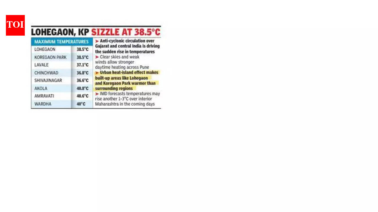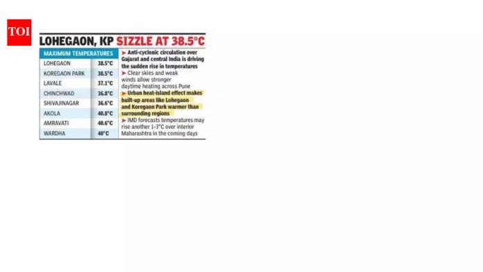 పూణె: పొడి గాలి, ప్రశాంతమైన గాలులు మరియు తుఫాను వ్యతిరేక పరిస్థితులు ఈ ప్రాంతం అంతటా పాదరసం పైకి నెట్టడంతో మార్చి మొదటి వారంలో నగరంలో పగటి ఉష్ణోగ్రతలు గణనీయంగా పెరిగాయి.శనివారం వాతావరణ సమాచారం ప్రకారం లోహెగావ్ మరియు కోరేగావ్ పార్క్‌లో గరిష్ట ఉష్ణోగ్రతలు 38.5°C, చించ్‌వాడ్‌లో 36.8°C, లావలేలో 37.1°C మరియు శివాజీనగర్‌లో 36.6°C. పోల్చి చూస్తే, ఫిబ్రవరి 27న అనేక స్టేషన్‌లలో ఉష్ణోగ్రతలు దాదాపు 31–32°C నమోదయ్యాయి, ఇది స్వల్ప వ్యవధిలో వేగవంతమైన పెరుగుదలను సూచిస్తుంది.