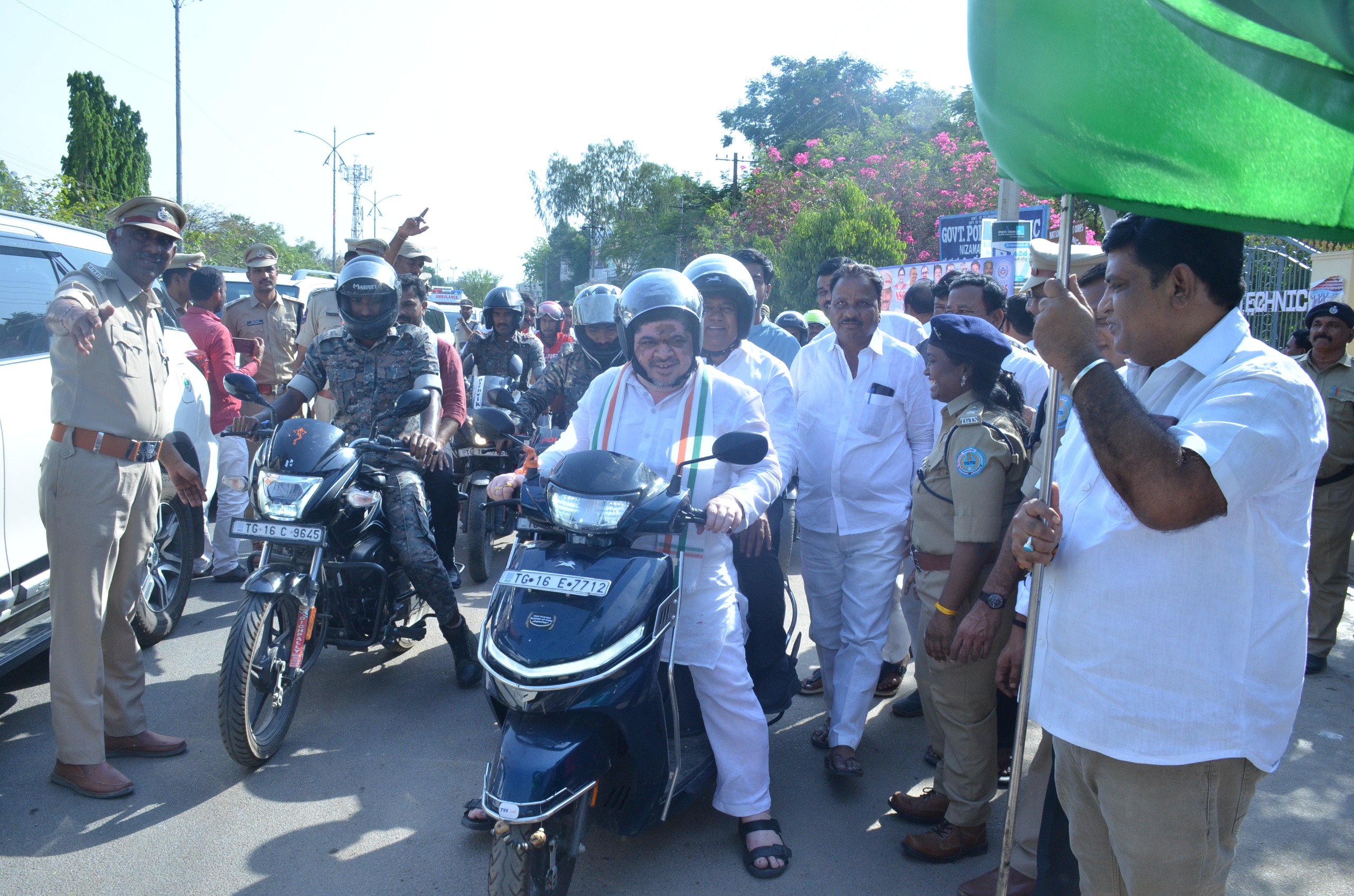 అరైవ్ అలైవ్ కార్యక్రమంలో పాల్గొనేందుకు నిజామాబాద్ నగర పర్యటనకు బుధవారం విచ్చేసిన రాష్ట్ర రవాణా, బీ.సీ సంక్షేమ శాఖ మంత్రి పొన్నం ప్రభాకర్ కు జిల్లా కలెక్టర్ ఇలా త్రిపాఠి, పోలీస్ కమిషనర్ సాయి చైతన్య, ఇతర అధికారులు ఘన స్వాగతం పలికారు. హెలికాఫ్టర్ ద్వారా మధ్యాహ్నం మూడు గంటల సమయంలో నిజామాబాద్ చేరుకున్న మంత్రిని సమీకృత జిల్లా కార్యాలయాల సముదాయం హెలిప్యాడ్ వద్ద కలెక్టర్, పోలీస్ కమిషనర్ తో పాటు అదనపు కలెక్టర్ దిలీప్ కుమార్, సబ్ కలెక్టర్లు వికాస్ మహతో, అభిగ్యాన్ మాల్వియ, రాష్ట్ర ఉర్దూ అకాడమీ చైర్మన్ తాహెర్ బిన్ హందాన్, రాష్ట్ర సహకార యూనియన్ లిమిటెడ్ చైర్మన్ మానాల మోహన్ రెడ్డి, నుడా చైర్మన్ కేశ వేణు, ఇతర జిల్లా అధికారులు పుష్ప గుచ్చాలు అందించి స్వాగతం పలికారు. అక్కడి నుండి పోలీసు బందోబస్తు మధ్య కాన్వాయ్ ద్వారా మంత్రి ప్రభుత్వ పాలిటెక్నిక్ కళాశాల వద్దకు చేరుకున్నారు. అరైవ్ అలైవ్ కార్యక్రమంలో భాగంగా రోడ్డు భద్రతపై అవగాహన కోసం చేపట్టిన బైక్ ర్యాలీని జెండా ఊపి లాంఛనంగా ప్రారంభించారు. ఈ ర్యాలీ కంటేశ్వర్ బైపాస్ చౌరస్తా వరకు చేరుకోగా, అక్కడ విద్యార్థులతో కలిసి మానవహారంగా ఏర్పడ్డారు. జిల్లా అధికారులతో పాటు రూరల్ ఎమ్మెల్యే డాక్టర్ భూపతి రెడ్డి, నగర మేయర్ ఉమారాణి, రాష్ట్ర ప్రభుత్వ ప్రత్యేక ప్రధాన కార్యదర్శి వికాస్ రాజ్, ఆర్టీసీ ఎండీ నాగిరెడ్డి, రాష్ట్ర వ్యవసాయ కమిషన్ సభ్యుడు గడుగు గంగాధర్ తదితరులు మానవహారంలో భాగస్వాములు అయ్యారు. రోడ్డు ప్రమాదాల నియంత్రణకు కృషి చేస్తామని, ట్రాఫిక్ నిబంధనలు విధిగా పాటిస్తామని మంత్రి పొన్నం ప్రభాకర్ ప్రతిజ్ఞ చేయించారు. ఈ సందర్భంగా మంత్రి మాట్లాడుతూ, అతివేగం, ట్రాఫిక్ నిబంధనల ఉల్లంఘన కారణంగా రోడ్డు ప్రమాదాలు చోటుచేసుకుని ఎంతో మంది ప్రాణాలు కోల్పోతున్నారని ఆవేదన వెలిబుచ్చారు. తద్వారా అనేక కుటుంబాలు ఇబ్బందులు పడాల్సి వస్తోందని అన్నారు. ఎన్ని చట్టాలు నిబంధనలు అమలు చేసినా, ప్రజలలో మార్పు రానంత వరకు ప్రమాదాలను నిలువరించడం సాధ్యం కాదని అన్నారు. దీనిని గుర్తిస్తూ పోలీస్ రవాణా శాఖల ఆధ్వర్యంలో ప్రజలలో అవగాహన కల్పించడం కోసం అరైవ్ అలైవ్ పేరుతో ప్రభుత్వం విస్తృత స్థాయిలో కార్యక్రమాలు నిర్వహిస్తోందని గుర్తు చేశారు. అన్ని వర్గాల వారు ఈ కార్యక్రమాల్లో పాల్గొని ప్రమాదాల నివారణకు తమవంతు దోహదపడాలని పిలుపునిచ్చారు. రోడ్డు ప్రమాదాలలో గాయపడిన క్షతగాత్రులను తక్షణమే స్పందించి ఆసుపత్రికి తరలించాలని, అలా కృషి చేసిన వారిని రహ్ వీర్ కింద రూ. 25 వేల నగదు ప్రోత్సాహకం ప్రభుత్వం ద్వారా అందజేయబడుతుందని తెలిపారు. ముఖ్యంగా విద్యార్థులు, యువత వాహనాలు నడిపే సమయంలో తప్పనిసరిగా నిబంధనలు పాటిస్తూ, ప్