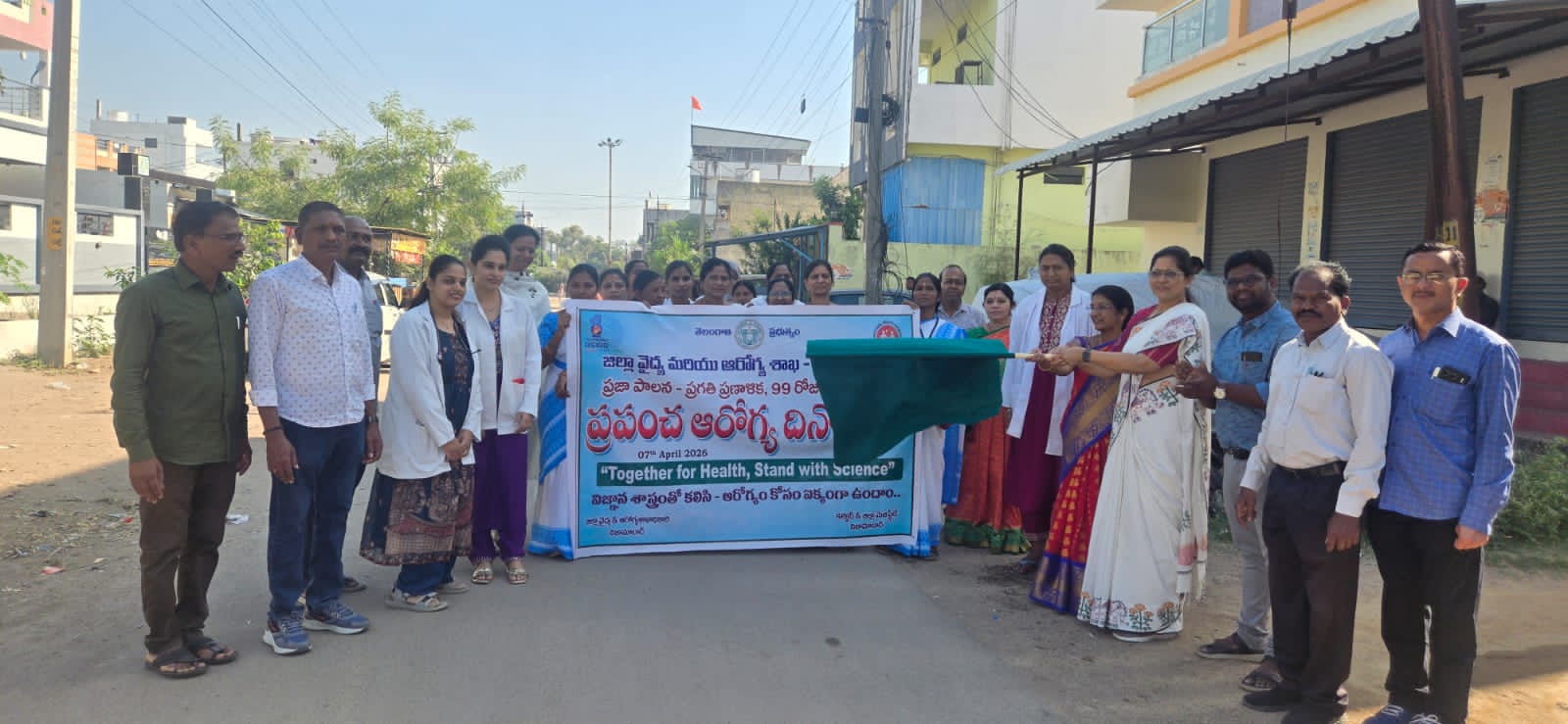 జిల్లా వైద్య ఆరోగ్యశాఖ ఆధ్వర్యంలో ప్రపంచ ఆరోగ్య దినోత్సవాన్ని పురస్కరించుకొని నిజాంబాద్ నగరంలో గల దుబ్బ పట్టణ ప్రాథమిక ఆరోగ్య కేంద్రం వద్ద ప్రపంచానికి ఆరోగ్య దినోత్సవ అవగాహన ర్యాలీని నిర్వహించడం జరిగింది. ఈ ర్యాలీ ని ఇండియన్ ఇన్స్టిట్యూట్ ఆఫ్ హెల్త్ అండ్ ఫ్యామిలీ వెల్ఫేర్గవర్నింగ్ కౌన్సిల్ స్టేట్ చైర్మన్ డాక్టర్ కవితా రెడ్డి గారు మరియు జిల్లా వైద్య ఆరోగ్యశాఖ అధికారిని డాక్టర్ బి రాజశ్రీ మేడం  తో కలిసి జండా ఊపి ప్రారంభించారు. ఈ సందర్భంగా దుబ్బా పట్టణ ప్రాథమిక ఆరోగ్య కేంద్రం పరిధిలో గల వీధుల గుండ ఆరోగ్య నినాదాలు చేస్తూ ర్యాలీ కొనసాగుతూ చివరికి పట్టణ ప్రాథమిక ఆరోగ్య కేంద్రానికి చేరుకోవడం జరిగింది. ఈ సందర్భంగా ఐఐ హెచ్ఎఫ్ డబ్ల్యూ రాష్ట్ర చైర్మన్ కవిత రెడ్డి గారు మాట్లాడుతూ పేద ప్రజ ల ఆరోగ్యం కోసం రాష్ట్ర ప్రభుత్వం అనేక చర్యలు తీసుకుంటుందని ముఖ్యంగా ప్రభుత్వ ఆసుపత్రిలో ప్రజలకు సంబంధించిన అన్ని రకాల ఆరోగ్య సేవలను అందించడం జరుగుతుందని అన్నారు. తేనెలు ఆశా కార్యకర్తలు ప్రతి గర్భిణీ స్త్రీలకి పోషకాహారము మరియు ఇతర ఆరోగ్య సమస్యలపై వివరిస్తూ రక్తహీనతకు గురికాకుండా జాగ్రత్తలు తీసుకోవాలన్నారు. అనంతరం జిల్లా వైద్య ఆరోగ్యశాఖలోని డిఎంహెచ్ఓ కార్యాలయంలో గల సమావేశ మందిరంలో అవగాహన సదస్సు నిర్వహించడం జరిగింది. ఈ సదస్సులో డిఎంహెచ్ఓ డాక్టర్ బి రాజశ్రీ మేడం గారు మాట్లాడుతూ వ్యాధినిర్ధక టీకాలు పోషకాహారము తీసుకోవడంతోపాటు మాత శిశు మరణాలను తగ్గించడం పరిసరాల పరిశుభ్రతను పాటించడం జీవనశైలి లో మార్పులు తీసుకొని జీవనశైలి వ్యాధులైన గుండెజాబ్బులు ,బిపి, మధుమేహం, క్యాన్సర్ లాంటి వ్యాధులకు గురికాకుండా జాగ్రత్తలు తీసుకోవాలన్నారు. అదేవిధంగా పర్యావ వరణ పరిరక్షణతో పాటు వాతావరణ కాలుష్యం సంభవించకుండా, గాలి నీరు కలుషితం కాకుండా పోషకాహారంలో కల్తీ జరగకుండా జాగ్రత్తలు తీసుకోవాలని, గర్భిణీ స్త్రీలు, బాలింతలు మరియు మహిళలందరూ మూఢనమ్మ కాలకు పోకుండా శాస్త్రీయ దృక్పథంతో ఆలోచించాలన్నారు. టిబి ముక్తభారత్ అభియాన్ కార్యక్రమంలో భాగంగా ఉద్యోగులకు క్షయ నియంత్రణ నిర్ధారణ పరీక్షల కోసం ఎక్స్రేను తీయడం జరిగింది అన్నారు.ఇంకా ఈ కార్యక్రమంలో డిప్యూటీ డిఎం అండ్ హెచ్ ఓ డాక్టర్ అశ్విని, వివో ఎన్ సి డి డాక్టర్ వెంకన్న, పి ఓ ఎం సి హెచ్ డాక్టర్ శ్వేత ,డీఎస్ఓ &పిఓ ఆమ్ అధికారి డాక్టర్ వెంకటేష్, ప్రోగ్రాం అధికారులు డాక్టర్ సుప్రియ, డాక్టర్ శిఖరా, డాక్టర్ శ్రావ్య, డాక్టర్ అవంతి, ఏవో రాజేశ్వర్, డిహెచ్ఇలు ఘనపూర్ వెంకటేశ్వర్లు, వేణుగోపాల్, సలీం, సూపరిండెంట్ వినయ్, సందీప్, నాగరాజు కార్యాలయ సిబ్బంది పాల్గొన్నారు.